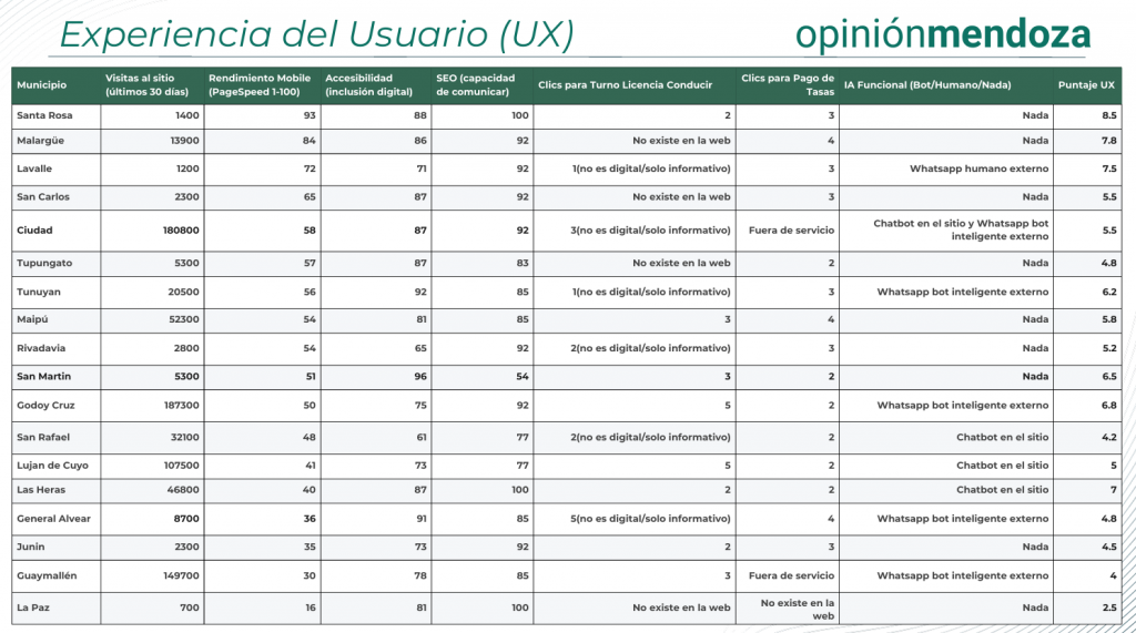 Un informe elaborado por Lucas Inostroza, codirector de la consultora Opinión Mendoza, analiza la madurez digital de los 18 municipios de Mendoza bajo tres dimensiones: Experiencia de Usuario (UX), Visibilidad y SEO Local y Transparencia Activa.