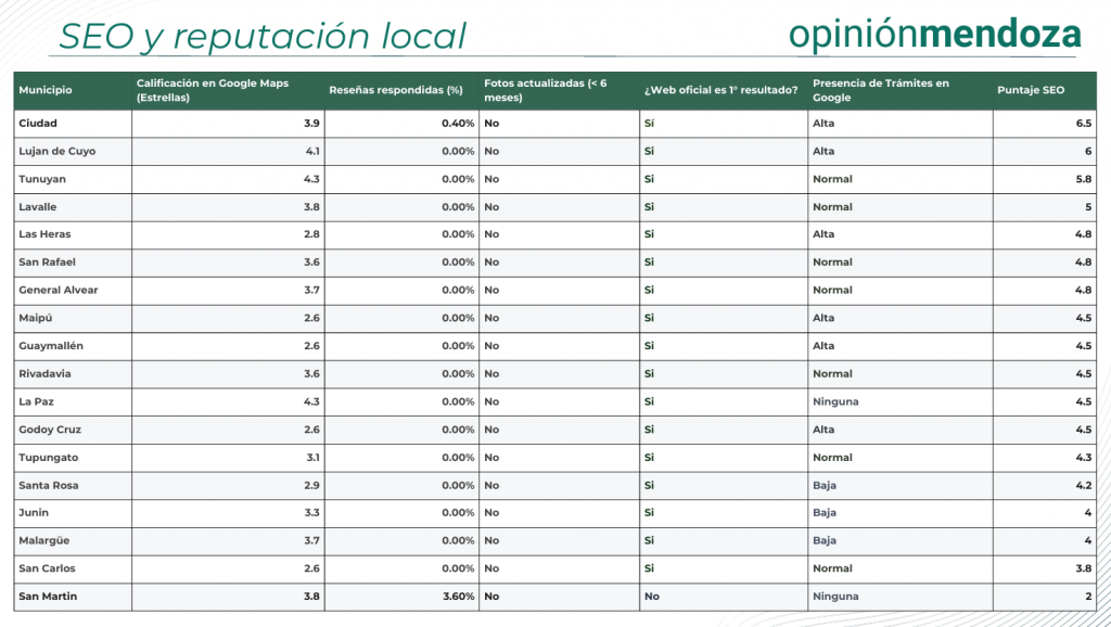 El abandono de las reseñas: El 0% de tasa de respuesta es la norma. Municipios con calificaciones críticas (2.6 estrellas como Maipú, Guaymallén y Godoy Cruz) no gestionan los reclamos que los vecinos dejan en Google Maps, dejando esa «vidriera» librada al azar.