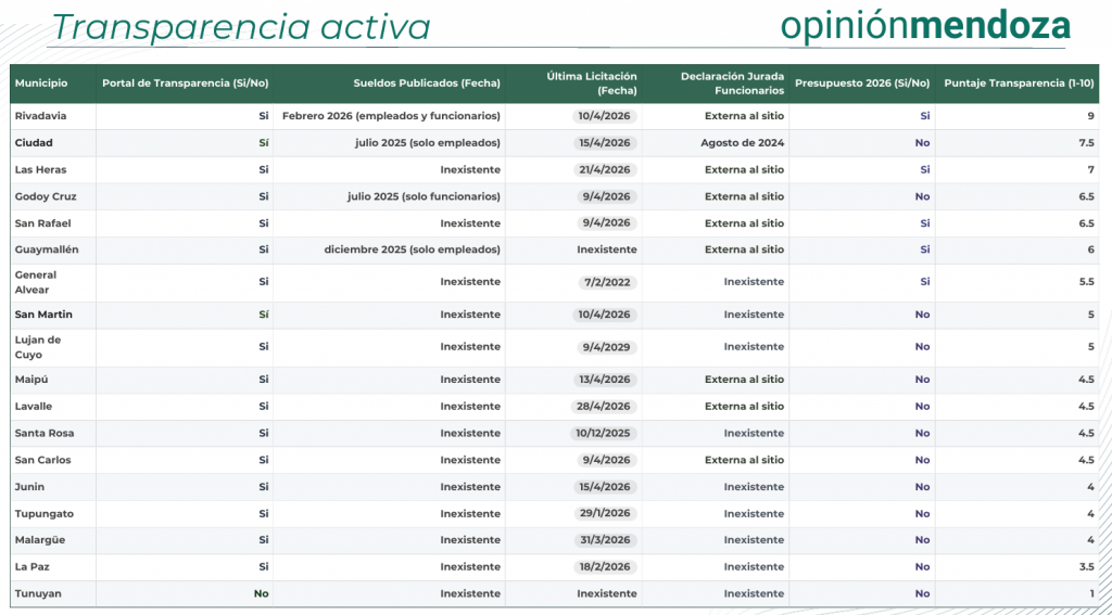 Rivadavia, el ejemplo provincial: Se destaca como el único municipio que cumple con el «estándar oro» de transparencia: sueldos de funcionarios y empleados publicados y actualizados (febrero 2026) y presupuesto disponible.